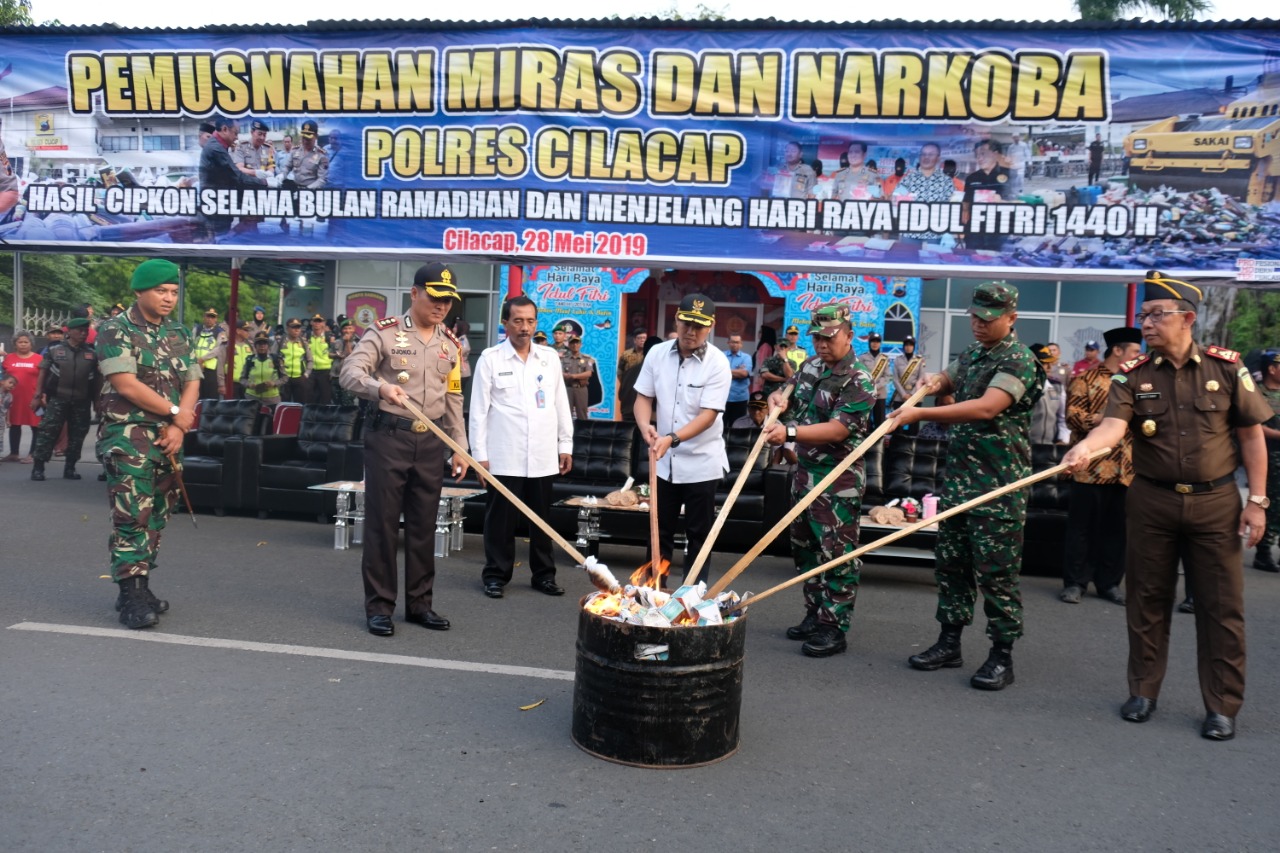 Barang bukti (BB) miras dan narkoba yang dimusnahkan merupakan hasil kegiatan operasi kepolisian dengan sasaran penyakit masyarakat (pekat) yang digelar seluruh jajaran Polres Cilacap sebagai bentuk komitmen Polri untuk terus menekan angka peredaran dan penalahgunaan miras dan narkoba yang marak beredar di kalangan masyarakat.
