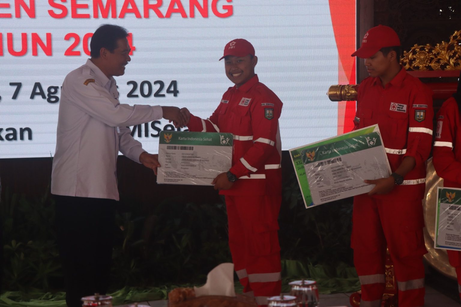 Ungaran, JATENG – Maspolin.id|| Palang Merah Indonesia (PMI) Kabupaten Semarang memberikan jaminan sosial dan kesehatan, kepada 10 sukarelawan yang bertugas di markas PMI. Penyerahan jaminan sosial dan kesehatan itu dilakukan secara simbolis oleh Sekda Kabupaten Semarang selalu Ketua PMI, Djarot Supriyoto pada pencanangan bulan dana PMI, di pendapa rumah dinas bupati setempat, Rabu (7/8/2024) siang.