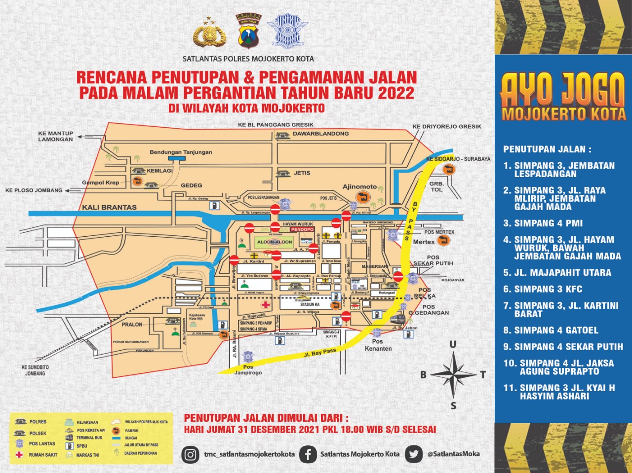 Kasat Lantas Polresta Mojokerto, AKP Heru Sudjio Budi Santoso menyampaikan, penutupan jalan itu akan dimulai pada Jumat (31/12/2021) pukul 18.00 WIB s/d Selesai.