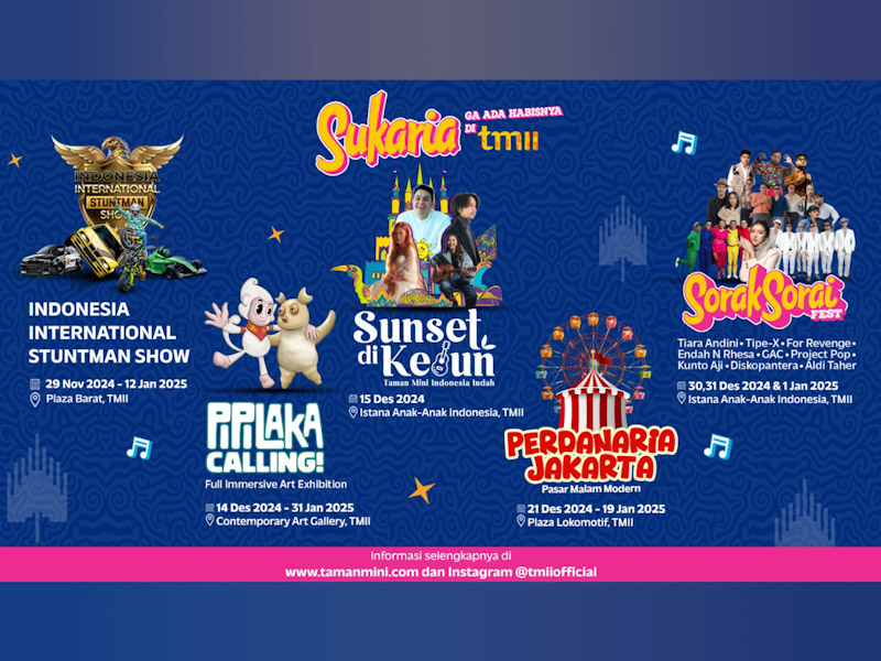 Kemudian, Pipilaka Calling–Immersive Exhibition pada 14 Desember 2024 sampai 31 Januari 2025, ada pula hiburan Sunset di Kebun pada 15 Desember 2024, Perdanaria Jakarta–Pasar Malam Modern pada 21 Desember 2024 hingga 19 Januari 2025.