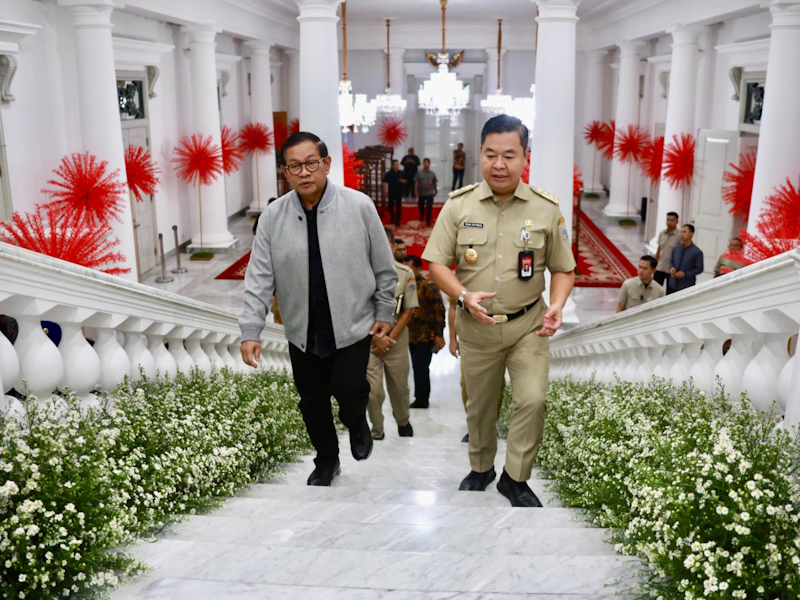 Dalam kesempatan tersebut, Pj Gubernur Teguh juga menemani Pramono Anung berkeliling sambil memperkenalkan beberapa ruangan di Balai Kota.