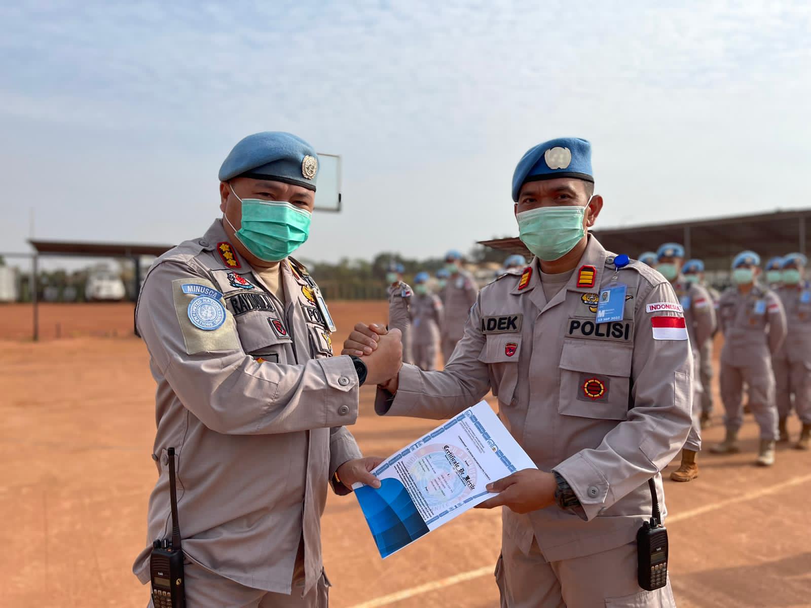 pekanbaru – Maspolin.id // Kepolisian Nasional Indonesiaan Divisi Hubungan Internasional Garuda Bhayangkara FPU 3 Minusca memberikan sertifikat penghargaan atas prestasi kepada 2 personel Satuan Brimob Polda Riau sebagai personel Terbaik yang diberikan untuk penyelesaian tugas Garuda Bhayangkara FPU di Garuda Camp – Bangui Republik Afrika Tengah