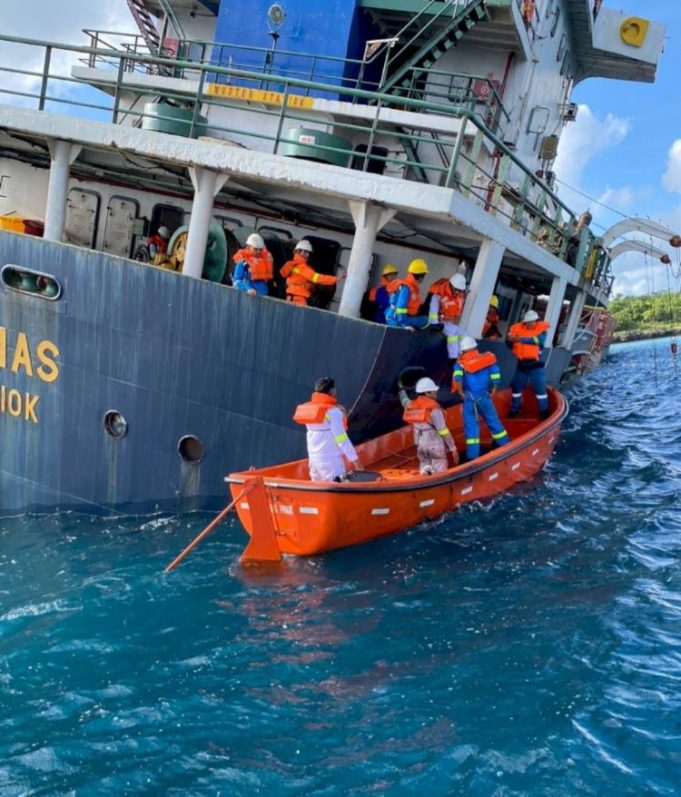 KUPANG, NTT – Maspolin.id|| Personel Ditpolairud Polda Nusa NTT melakukan aksi penyelamatan terhadap para awak kapal kargo MV Kuala Mas yang tenggelam di perairan Pelabuhan Polairud Desa Bolok, Kecamatan Kupang Barat, Kabupaten Kupang pada Sabtu kemarin.