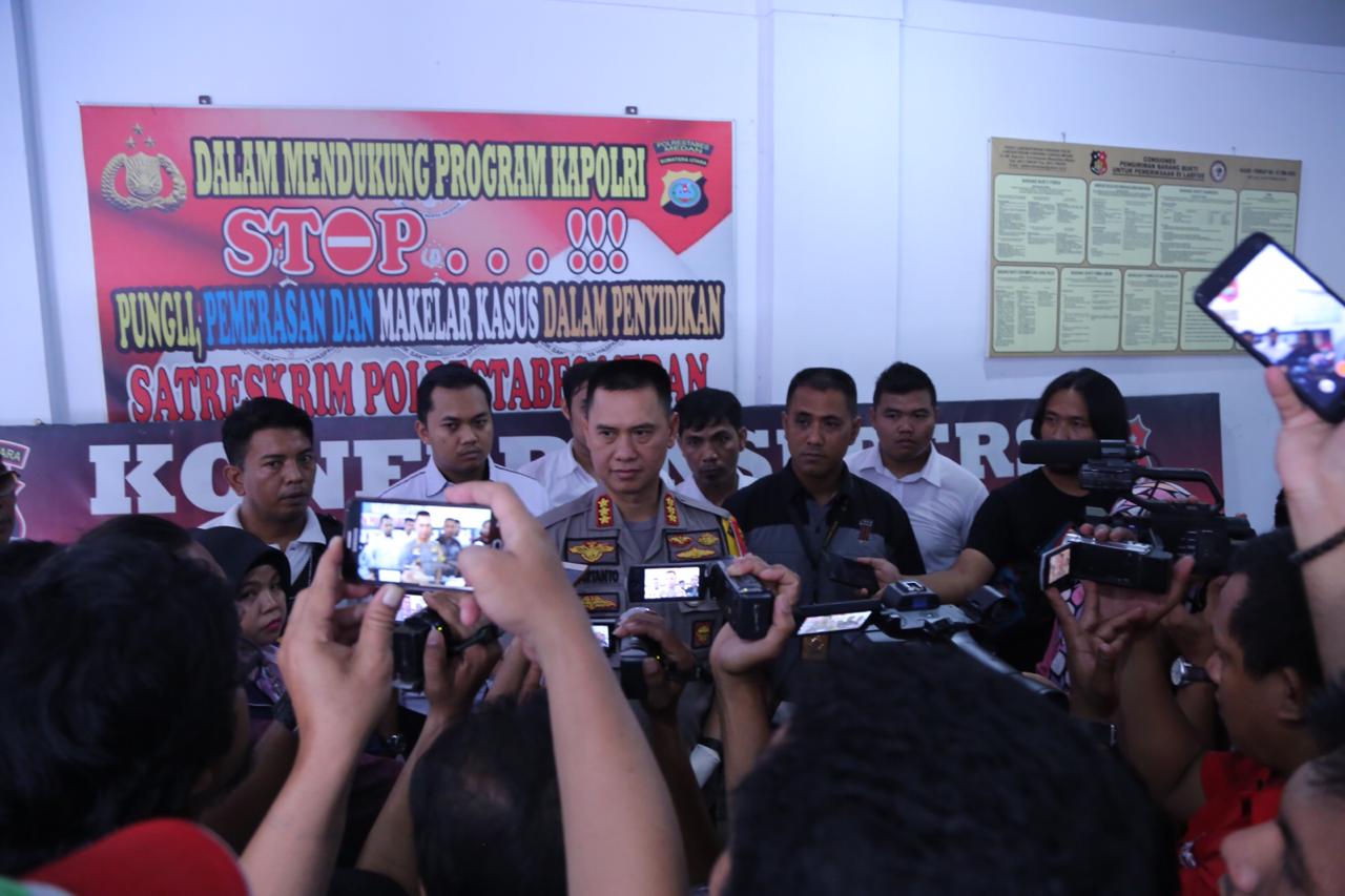 Medan,Maspolin.id – Kapolrestabes Medan Kombes Pol Dr Dadang Hartanto,SH,Sik,MSi Melaksanakan Kegiatan Press Relese tentang ditangkapnya tiga orang pelaku pembeggalan di Jalan Benteng Hilir Bandar Kalipa Kecamatan Percut Sei Tuan Oleh tim Pegasus Polrestabes Medan,Senin 29 July 2019.