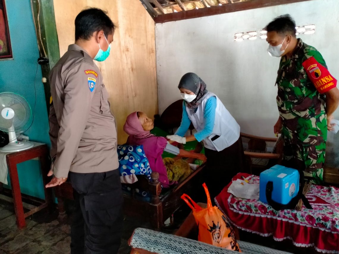 Polres Bojonegoro – Maspolin.id|| Kapolsek Kanor AKP Nugroho Basuki bersama Bhabinkamtibmas Bripka Tajun Romadhon, Babinsa Pelda Nurhasim serta Bidan Desa setempat melakukan kegiatan vaksinasi Covid-19 khusus warga lanjut usia (lansia). Vaksinasi dilakukan dengan cara dari rumah ke rumah tempatnya di Desa Bakung Kecamatan Kanor Kabupaten Bojonegoro, Sabtu (27/11/2021).