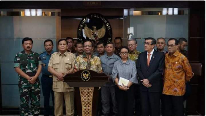 Jakarta,Maspolin.id – Menko Polhukam Mahfud MD didampingi Menlu, Menhan, Menhankam, dan Panglima TNI menyampaikan keterangan pers terkait sikap Pemerintah RI terhadap pelanggaran Kapal China di Perainan Natuna, di Kantor Kemenko Polhukam, Jakarta, Jumat (3/1/2020) siang.