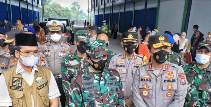Dari rangkaian kegiatan Pangdam V Brawijaya dan Kapolda Jatim di Bangkalan Madura. Terakhir melakukan pengecekan di penyekatan Ruko Petapan di Desa Labeng, Kecamatan Sukolilo, Kabupaten Bangkalan.