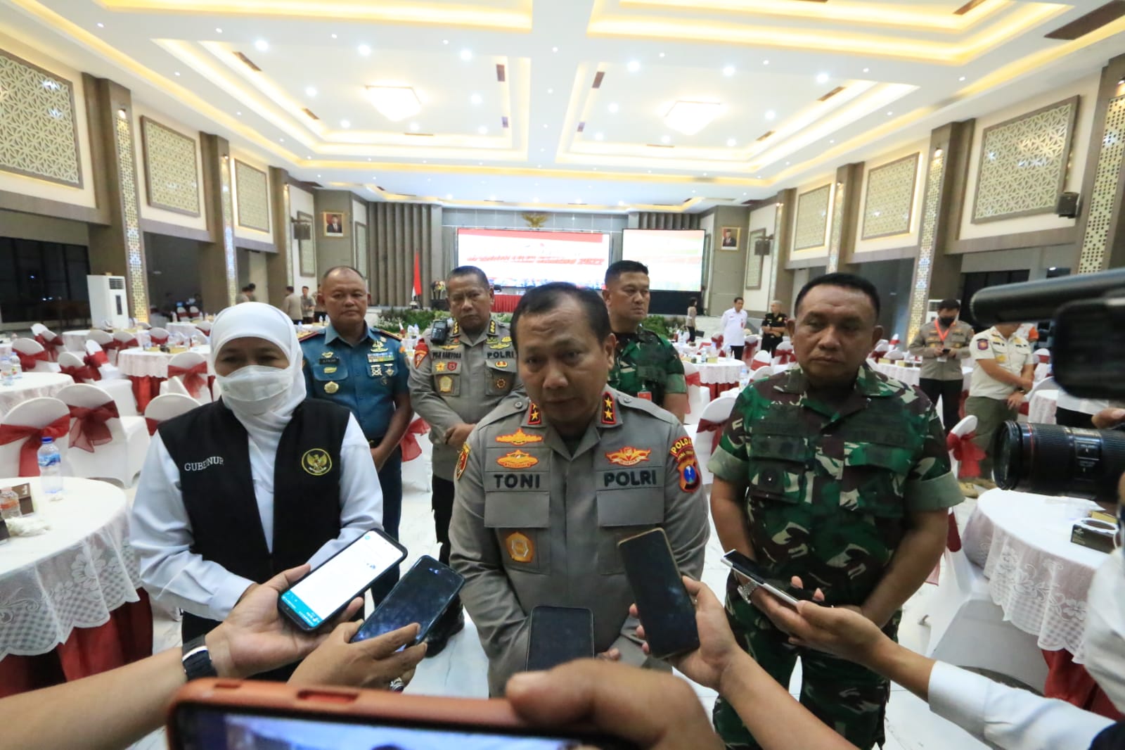 SURABAYA – Maspolin.id|| Forkopimda Jawa Timur gelar Rapat Koordinasi (Rakor) lintas sektoral tingkat Provinsi, dalam rangka Operasi Terpusat Lilin Semeru 2022, di Gedung Mahameru Mapolda Jatim, pada Rabu (21/12/2022). Operasi Terpusat Lilin Semeru 2022 ini dilakukan untuk mengantisipasi tingkat kerawanan di wilayah Jawa Timur, dalam rangka perayaan Natal 2022 dan Tahun Baru (Nataru) 2023.Antisipasi tersebut dilakukan mulai dari penanggulangan bencana alam dan non alam (Covid-19), antisipasi kerawanan kejahatan, antisipasi di titik-titik daerah rawan kecelakaan lalulintas dan antisipasi aksi terorisme dan radikalisme di wilayah Jawa Timur. Selain itu, Forkopimda Jatim juga telah menyiapkan armada transportasi dan infrastruktur jalan, serta persedian stok BBM dan pendistribusian listrik di wilayah Jatim pada perayaan Natal 2022 dan Tahun Baru 2023Kapolda Jawa Timur Irjen Pol Dr. Toni Harmanto,M.H menyampaikan, Rakor Operasi Lilin Semeru 2022 ini gelar untuk menyiapkan pelaksanaan pengamanan kegiatan masyarakat dalam perayaan Natal dan Tahun Baru, agar bisa berjalan aman, nyaman dan lancar. “Kesalahan-kesalahan yang bisa kita atasi, sedini mungkin kita segera antisipasi. Tadi sudah dipaparkan isu-isu persoalan yang akan dihadapi dan mungkin akan terjadi, ini menyikapi hal-hal yang kemungkinan muncul terhadap aktivitas masyarakat di Natal dan Tahun Baru,” jelas Irjen Toni usai Rakor. Kapolda Jatim berharap aktivitas ini akan terus berlanjut dengan kesiapan yang lebih teknis lagi, seperti yang disampaikan Gubernur Jawa Timur tentang kesediaan pahan pokok, komoditi tertentu yang membutuhkan pengawasan.Selain itu, Irjen Pol Toni Harmanto juga menegaskan hal – hal yang berkaitan dengan aktivitas masyarakat seperti tadi dicontohkan, sopir kendaraan yang lelah dan sopir cadangan yang perlu disiapkan juga diantisipasi, seperti pemeriksaan urine.”Ini biasa tiap tahun kita lakukan dalam pengamanan idul fitri, natal dan tahun baru. Hampir sama, tapi aktivitas penanganan kita lebih ditingkatkan. Dengan penjelasan kita tadi, ada peningkatan kriminalitas, peningkatan aktivitas masyarakat dibanding tahun lalu,” tandas Kapolda Jatim. “Tahun lalu di bulan Mei ada aktivitas wahana yang memakan 9 korban jiwa, ini jadi konsep kita. Makanya tempat-tempat publik atau wisata nantinya yang akan dikunjungi masyarakat, akan jadi sasaran aktivitas kegiatan kita. Kita akan re-cek kembali sebelum masyarakat hadir di sana untuk menikmati liburan,” paparnya. Kapolda Jatim menambahkan, dalam Rakor ini juga membahas antisipasi fenomena perubahan cuaca yang berdampak pafa bencana alam. “Bu Gubernur, BNPB dan Karo Ops tadi sudah menyampaikan, dengan melihat fenomena perubahan cuaca, kemungkinan-kemungkinan yang bisa berdampak dengan bencana, yang jelas kami siap menghadapi bencana,” pungkas Kapolda Jatim Irjen Pol Toni Harmanto, di dampingi Gubernur Jatim Khofifah Indar Parawansa. (*)