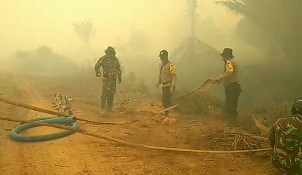 Aparat Kepolisian bersama Anggota TNI dan Tim Karhutla Berusaha Memadamkan Titik Api