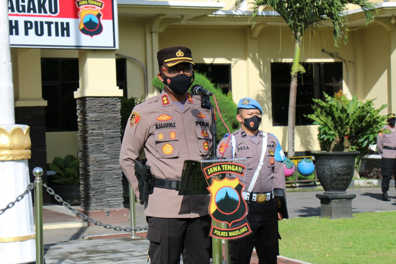 Magelang – Maspolin.id // Kapolres Magelang AKBP Mochammad Sajarod Zakun, S.H., S.I.K. memimpin kegiatan Apel Jam Pimpinan di Halaman Depan Polres Magelang, Senin (29/11/2021). Pada kesempatan itu, Kapolres Sajarod menyampaikan 3(tiga) strategi penanganan Covid-19, yang harus dipahami dan dilaksanakan bersama.