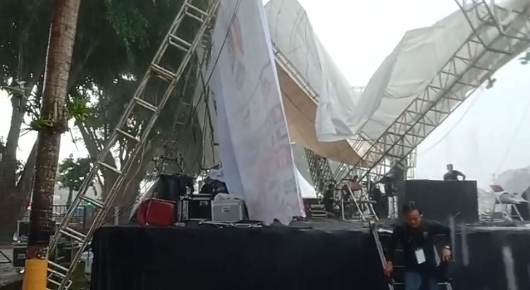 Sontak para pekerja yang tengah menyiapkan peralatan di bawahnya berlarian.peralatan yang ada di atas panggung seperti sound system dan lighting tampak tertimpa air yang tumpah dari atap yang roboh.