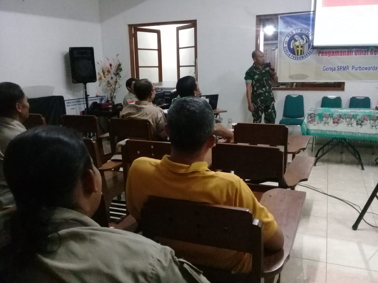 Surakarta,Maspolin.id – Babinsa Koramil 04/Jebres Kodim 0735 Surakarta, Sertu Jhony Dedy Tamonob & Sertu Joko Riyanto, mengarahkan tata cara pengamanan kepada anggota Tim PAM di Aula Maria Paroki Purbowardayan Jebres Surakarta.