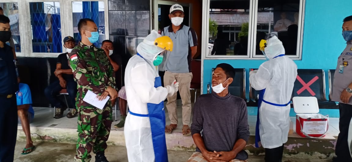 Babinsa serta Polisi Perairan Penjajap Lansung turun dan ikut mendampingi Bidan Desa untuk melaksanakan pengamanan terhadap 20 warga yang akan melaksanakan Tes Swab di Kantor Perikanan Penjajap.
