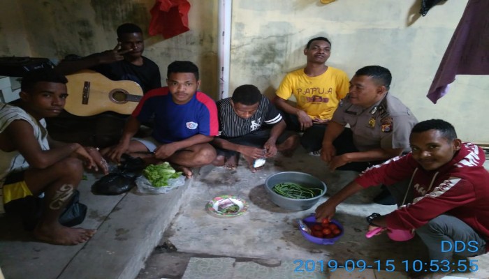 Banten,Maspolin.id – Kabupaten Serang. Demi menjaga serta menjamin keamanan bagi para pelajar asal Papua yang berada di wilayah hukum Polres Serang, jajaran Polsek Kragilan Bhabinkamtibmas Desa Cisait Aiptu Dadang S dengan rasa cinta dan humanis mengajak para siswa asal Papua yang mengenyam pendidikan di SMKN 1 Kragilan, dengan cara masak bersama, Minggu (15/09/19) malam tadi.