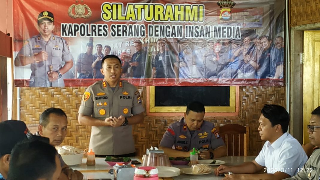 Kabupaten Serang (Banten),Maspolin.id – Kapolres Serang AKBP Mariyono didampingi Wakapolres Serang Kompol Agung Cahyono, menggelar silaturrahim bersama Insan Pers, di salah satu rumah makan di Ciruas, Kabupaten Serang, Rabu (11/03/2020).