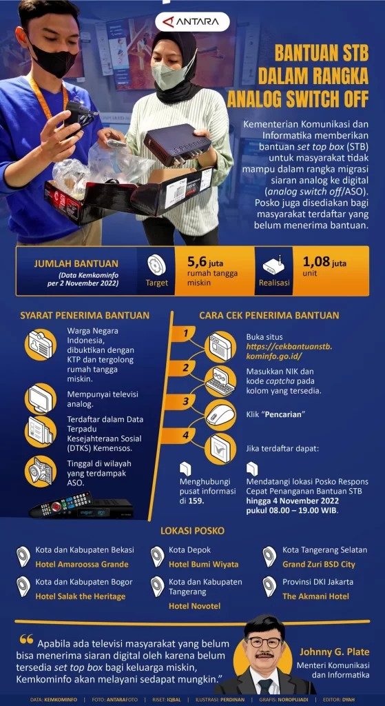 Kementerian Komunikasi dan Informatika memberikan bantuan set top box (STB) untuk masyarakat tidak mampu dalam rangka migrasi siaran analog ke digital (analog switch off/ASO). Posko juga disediakan bagi masyarakat terdaftar yang belum menerima bantuan.