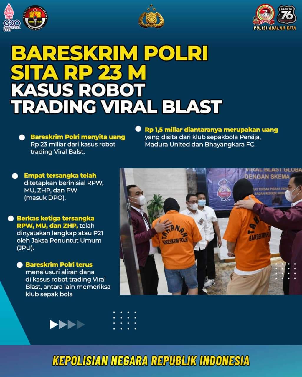 Bareskrim Polri terus menelusuri aliran dana di kasus robot trading Viral Blast, antara lain memeriksa klub sepak bola