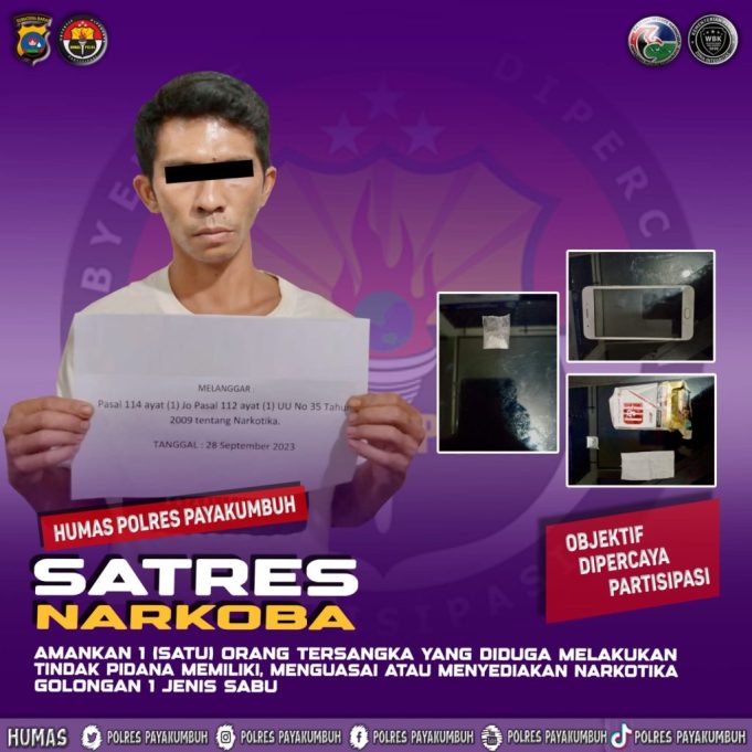 Payakumbuh – Maspolin.id|| Tim Phantom Sat Narkoba Polres Payakumbuh menangkap seorang tersangka yang di sangkakan telah melakukan tindak pidana narkotika jenis sabu-sabu, Kamis (28/09) bertempat di sebuah halaman rumah Kelurahan Payobasung, Payakumbuh Timur