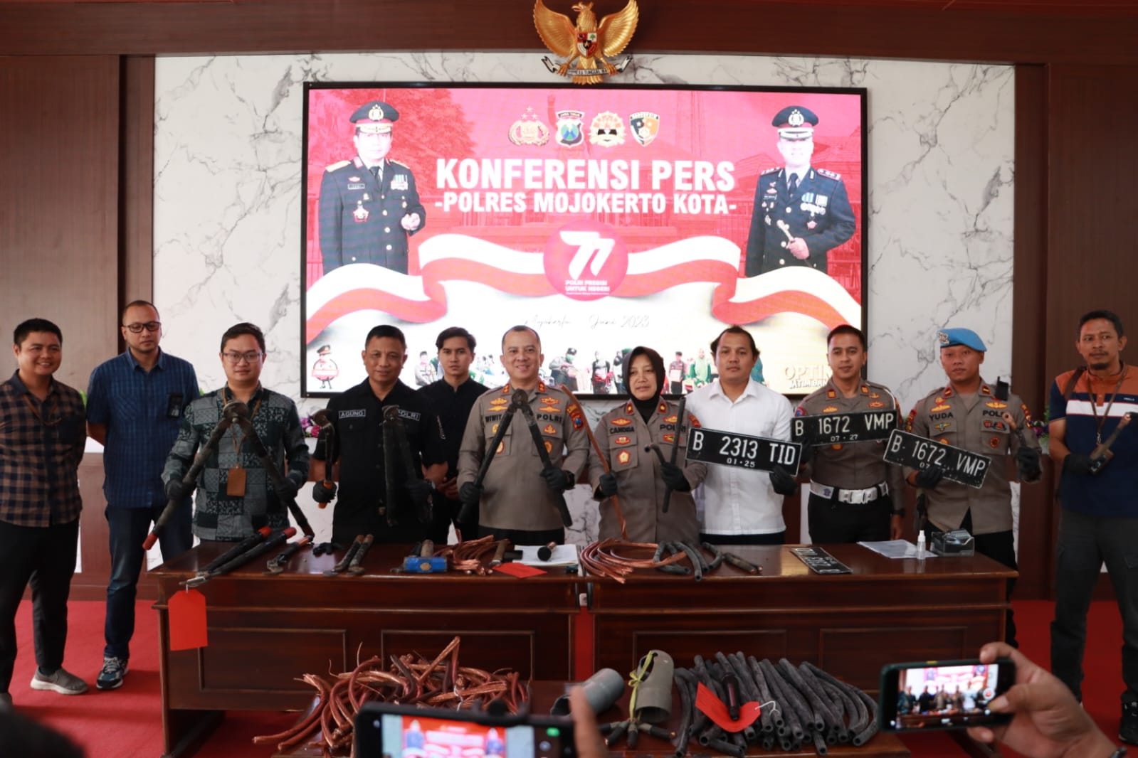 Mojokerto – Maspolin.id|| Mewujudkan Kamtibmas tetap Aman dan Kondusif, Polresta Mojokerto berhasil amankan 4 pelaku pencurian kabel listrik PLN. Hal itu diungkap Kapolresta Mojokerto AKBP Wiwit Adisatria S.H., S.I.K., M.T, pada saat Konferensi Pers di Polresta Mojokerto. Rabu (05/07/2023)