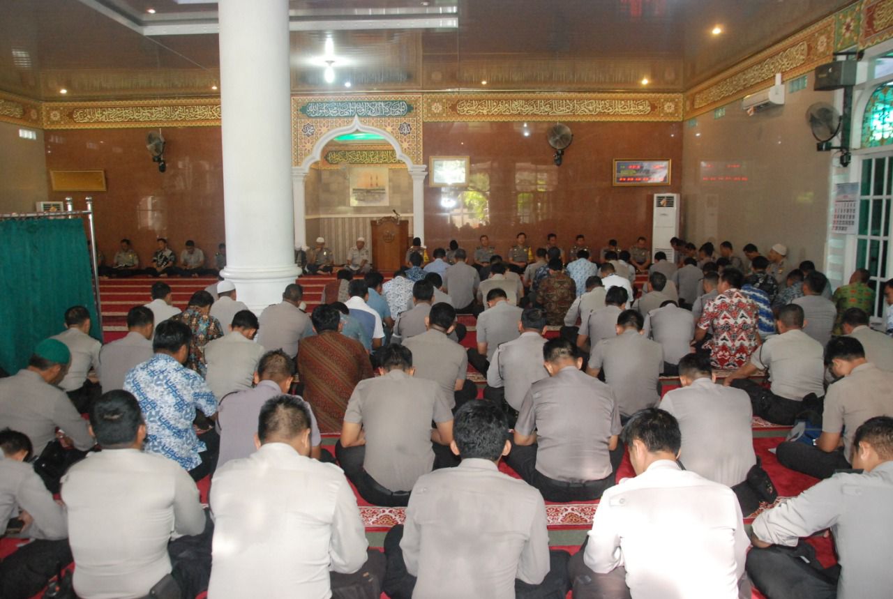 Bandar Lampung – Bertempat di Masjid Taqwa Bhayangkara Polresta Bandar Lampung yang berada di lingkungan Mapolresta Bandar Lampung, guna meningkatkan kadar keimanan dan ketaqwaan personil Polresta Bandar Lampung, telah melaksanakan pembinaan rohani dan mental (Binrohtal) terhadap anggota yang beragama Islam dengan membaca surat Yasin dan berdoa bersama, Jumat, (04/01/19).