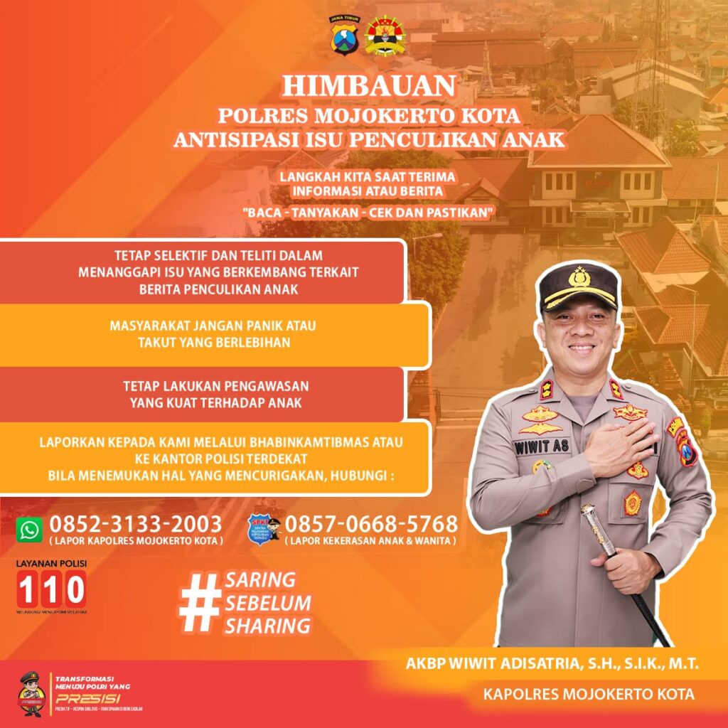 Kapolresta Mojokerto, “Tetap selektif dan teliti dalam menanggapi isu yang berkembang terkait berita penculikan anak, jangan panik atau takut secara berlebihan dan tetap lakukan pengawasan yang kuat terhadap anak.” Jelasnya.