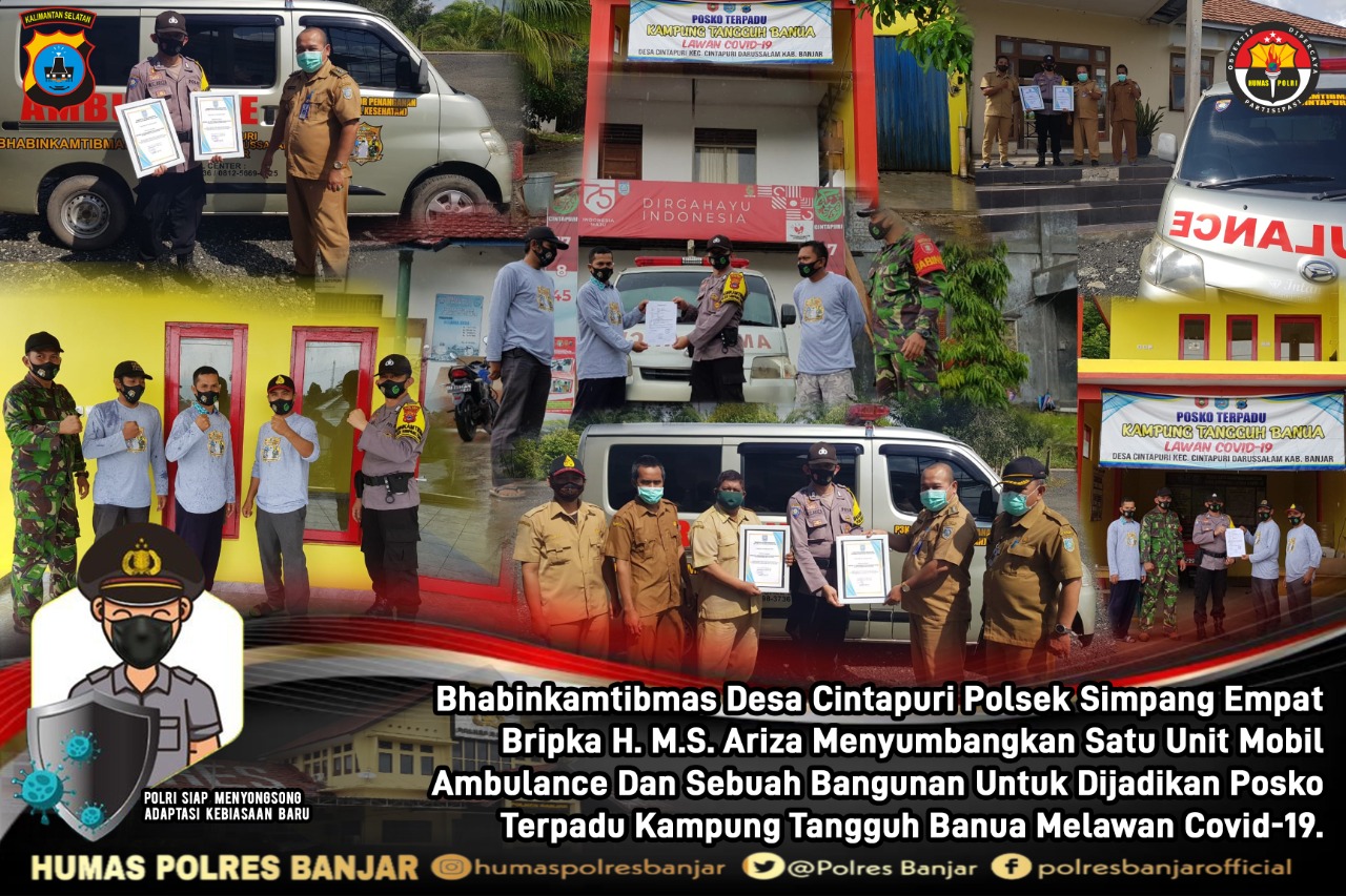 MASPOLIN || BANJAR – Bhabinkamtibmas Desa Cintapuri Polsek Simpang Empat Polres Banjar, Polda Kalsel, Bripka H. Muhammad Salahuddin Ariza menyumbangkan satu unit Mobil Ambulance dan sebuah bangunan untuk dijadikan Posko Terpadu Kampung Tangguh Banua Melawan Covid-19.