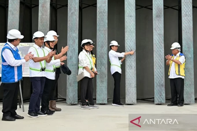JAKARTA (ANTARA) – Maspolin.id|| Presiden Joko Widodo meninjau perkembangan pembangunan dan memasang bilah pertama Garuda di Kantor Presiden, Ibu Kota Nusantara (IKN), Penajam Paser Utara, Kalimantan Timur, Jumat.