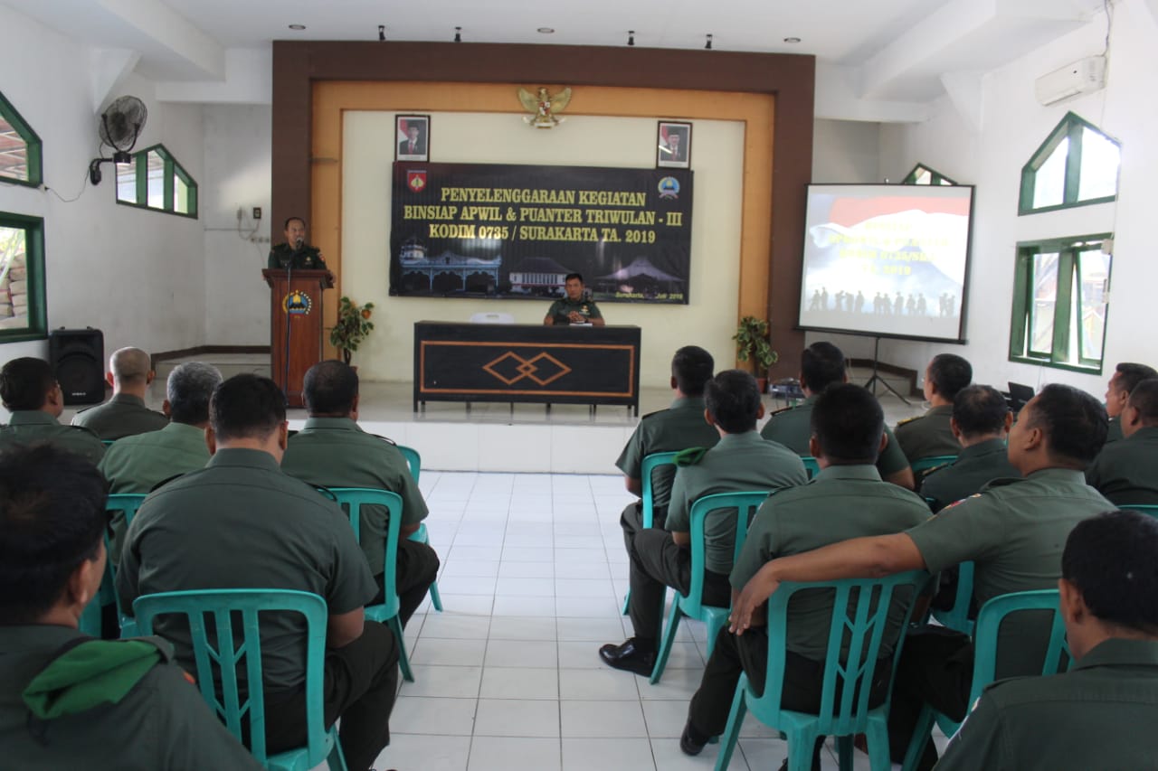 Surakarta,Maspolin.id – Dalam rangka meningkatkan kesiapan Prajurit dalam pelaksanaan pembinaan dan pemberdayaan wilayah pertahanan di wilayah, Kodim 0735/Surakarta melaksanakan kegiatan Pembinaan Kesiapan Aparat Kewilayahan Dan Kemampuan Teritorial (Binsiap Apwil dan Puanter) Aparat Kowil Tri Wulan III TA. 2019 di Aula Makodim 0735/Surakarta, Jln.A Yani No.349, Kelurahan Kerten, Kecamatan Laweyan, Rabu (31-07-2019).