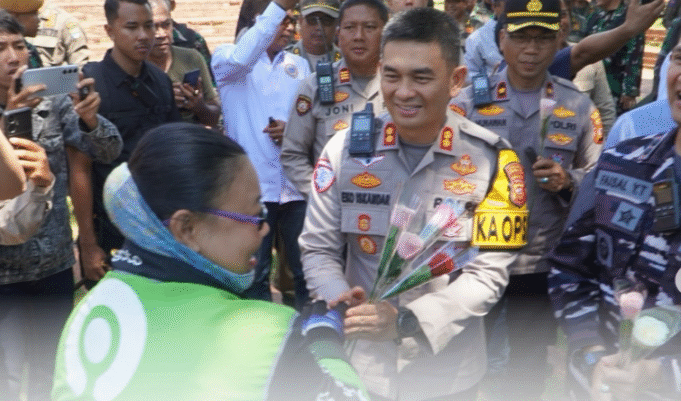 Kota Cirebon, JAWA BARAT – Maspolin.id|| Sebuah aksi simpatik mewarnai Kota Cirebon ketika komunitas ojek online (ojol) setempat memberikan setangkai bunga mawar kepada Kapolres Cirebon Kota, AKBP Eko Iskandar, S.H., S.I.K., M.Si., pada hari Rabu, 3 September 2025. Kegiatan ini berlangsung di Jalan R.A Kartini, tepat di depan Rumah Dinas Bupati Cirebon.