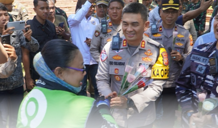 Setelah penyerahan simbolis kepada Kapolres, rombongan ojol melanjutkan aksi dengan membagikan bunga kepada personel TNI-Polri dan Satpol PP di Alun-Alun Kejaksan. Momen tersebut disambut hangat oleh warga sekitar sebagai wujud nyata kebersamaan dan keharmonisan antara aparat keamanan dengan masyarakat dalam menjaga Kota Cirebon tetap damai dan kondusif.