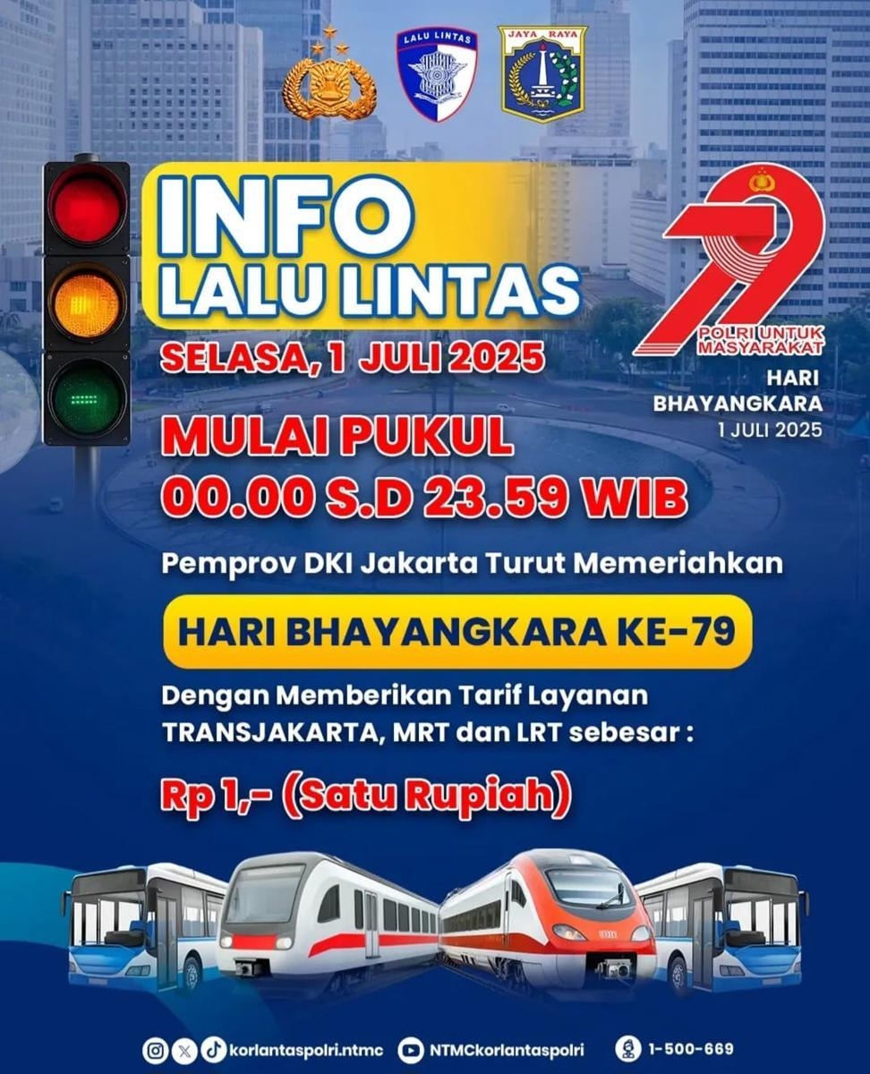 Layanan transportasi publik Rp1, kami hadirkan sebagai wujud dukungan Pemprov DKI Jakarta terhadap peringatan HUT ke-79 Bhayangkara sekaligus mendorong penggunaan transportasi umum oleh masyarakat, ujar Syafrin, Selasa (1/7/2025).