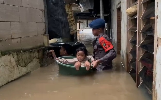 Satuan Brimob Polda Metro Jaya tetap bersiaga dan mengimbau masyarakat agar waspada terhadap potensi banjir susulan serta mengikuti arahan petugas di lapangan.