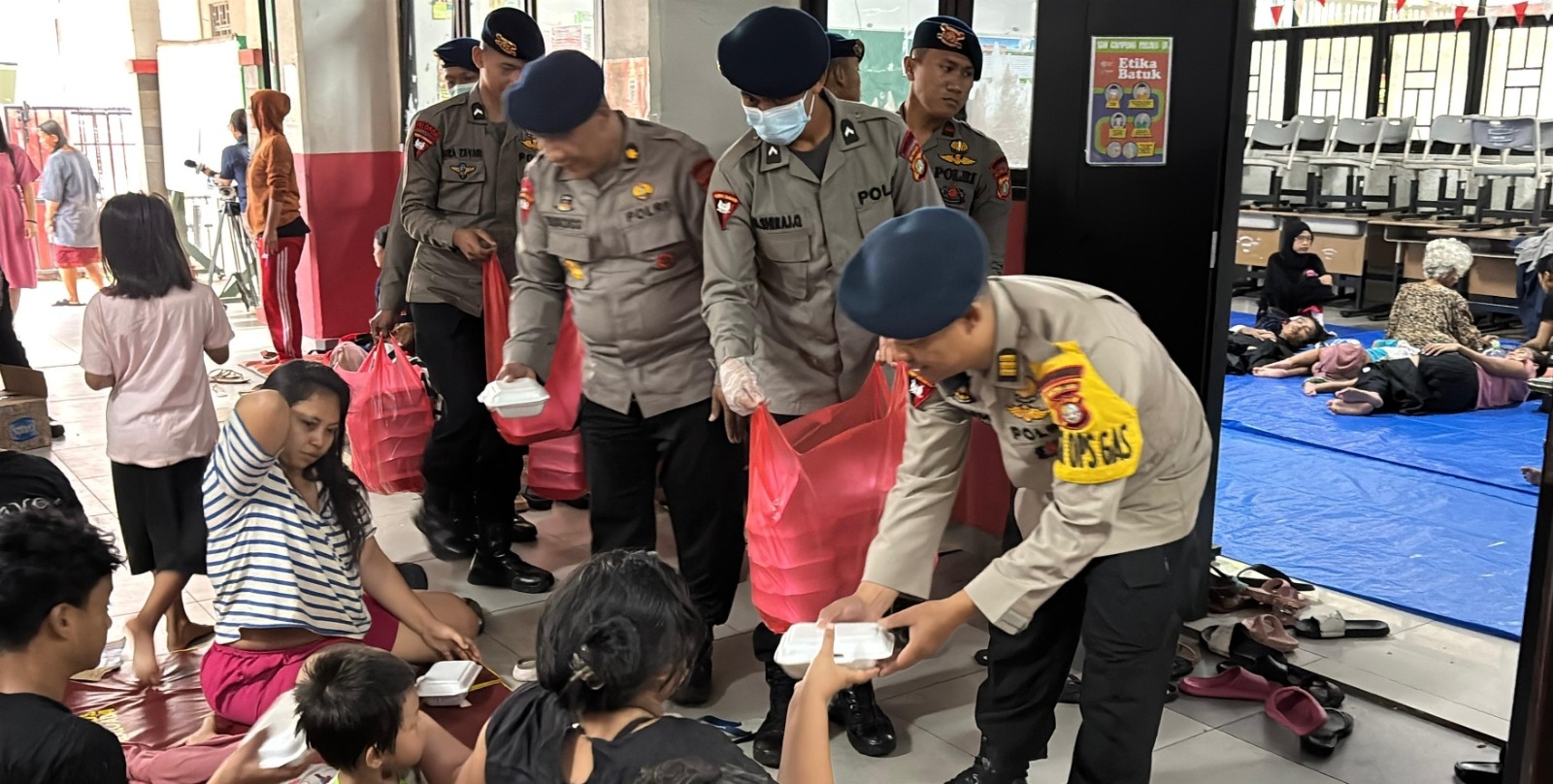 Sekitar pukul 06.30 WIB, tim dapur lapangan mulai membagikan sarapan berupa nasi goreng spesial kepada warga yang mengungsi di SDN Kampung Melayu 01. Hingga pukul 07.30 WIB, sebanyak 300 bungkus makanan telah dibagikan.