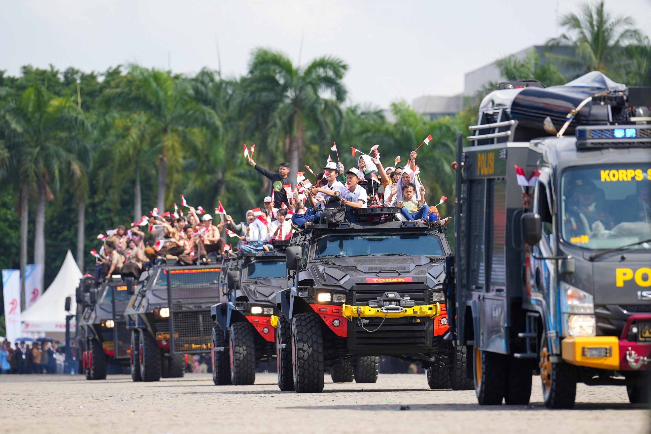 Dalam kegiatan tersebut ditampilkan sejumlah aksi oleh personel Kepolisian, salah satunya adalah terjun payung. Dalam pantauan langsung di Monas, terlihat ada penerjun Polri yang membentangkan kain besar bergambar Presiden Prabowo Subianto.