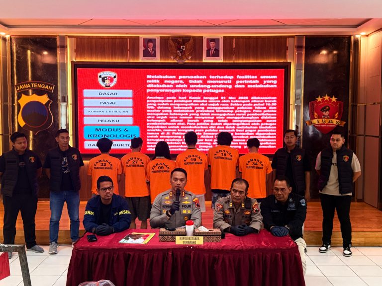 SEMARANG, JAWA TENGAH – Maspolin.id|| Penyelidikan Kepolisian atas aksi unjuk rasa Mayday oleh kelompok anarko yang berakhir rusuh di Semarang pada Kamis (1/5) terus dilakukan. Dari 14 orang yang sempat diamankan, Polisi akhirnya telah menetapkan 6 orang sebagai tersangka. Kapolrestabes Semarang Kombes Pol M.Syahduddi yang di dampingi Kasat Reskrim AKBP Andika Dharma Sena menyebut ke-6 orang tersangka yang ditetapkan telah memenuhi unsur tindak pidana melawan aparat saat bertugas disertai melakukan pengrusakan fasilitas umum secara bersama-sama sebagaimana di atur dalam pasal 214 KUHP subsider pasal 170 KUHP.