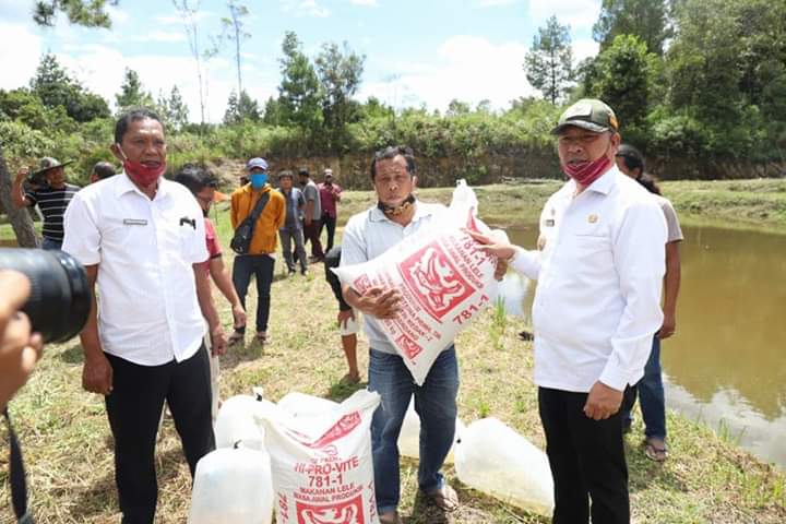 Bupati Tapanuli Utara Drs. Nikson Nababan, M.Si didampingi Kadis Ketahanan Pangan dan Perikanan Longgos Pandiangan menabur 5.000 benih ikan mas dan ikan nila pada 9 petak kolam milik masyarakat Torang Tampubolon di Desa Pohan Tonga Kecamatan Siborongborong Rabu, ( 17/06/2020).