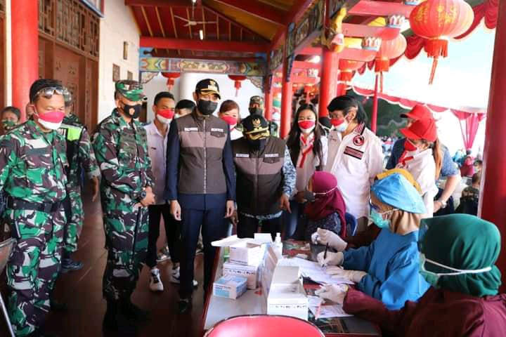 Tuban,maspolin.id- Bupati Tuban, Aditya Halindra Faridzky, SE, bersama Wabup H. Riyadi, SH., dan Dandim 0811/Tuban Letkol Inf Viliala Romadhon meninjau pelaksanaan vaksinasi dosis kedua dalam rangka Serbuan Vaksin Kodim 0811/Tuban di Klenteng Kwan Sing Bio, Tuban, Kamis (12/08/2021).