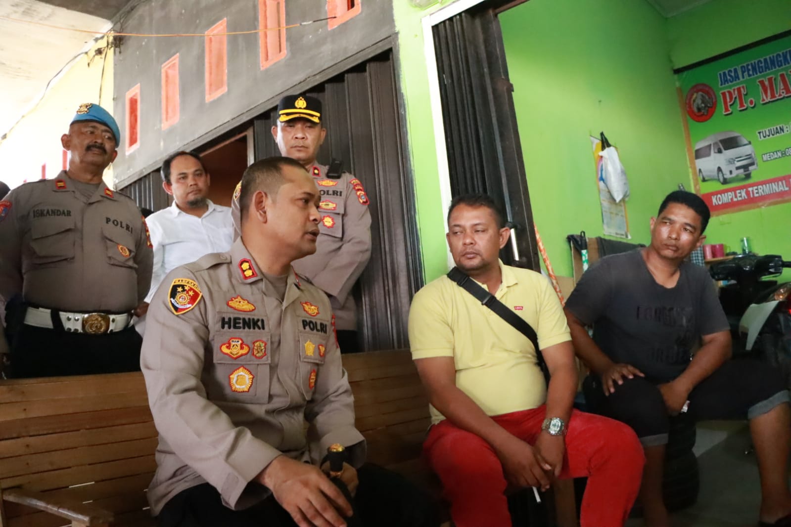 Tampak Kapolres Lhokseumawe menyambangi sejumlah loket yang sedang beroperasi di lokasi tersebut. Loket ini menyediakan layanan jenis angkutan mulai dari mobil L300, Jumbo, Hiace dan mobil Bireuen Ekspres (BE).