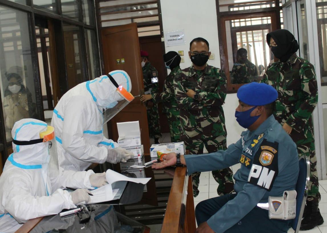 MASPOLIN || YOGYAKARTA – Dalam upaya mencegah penyebaran virus Covid-19 di lingkungan dinas, keluarga dan masyarakat sekitar, Komandan Pangkalan TNI Angkatan Laut (Danlanal) Yogyakarta Lantamal V Koarmada II Kolonel Marinir Bambang Adriantoro mewajibkan seluruh prajurit dan Pegawai Negeri Sipil (PNS) Lanal Yogyakarta melaksanakan rapid test Covid-19, seperti yang terlaksana hari pertama test pada Kamis (04/06).