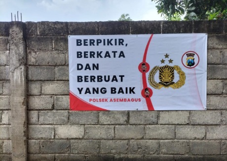 Bukan hanya itu, sebab di sebelah barat dan depan gedung utama Mapolsek Asembagus juga terpampang banner dengan tulisan cukup besar yang bertuliskan “Berpikir, Berkata dan Berbuat yang Baik (4b)” hal ini yang dijadikan Moto/semboyan ungkap Perwira yang sebelumnya bertugas sebagai KBO Satreskrim Polres Situbondo.