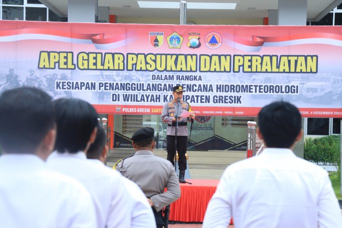 Gresik – Maspolin.id|| Dalam rangka kesiapan penanggulangan bencana hidrometeorologi di Kabupaten Gresik. Kapolres Gresik AKBP Adhitya Panji Anom, pimpin apel gelar pasukan dan peralatan dilaksanakan di halaman Mapolres Gresik, Senin (04/12/2023).