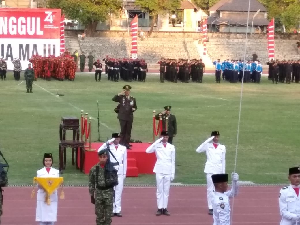 Surakarta,Maspolin.id – Bertempat di Stadion R. Maladi Sriwedari Jl. Bhayangkara, Kel. Sriwedari, Kec. Laweyan, Kota Surakarta telah berlangsung Upacara Penurunan Bendera dalam rangka peringatan HUT ke 74 Kemerdekaan Republik Indonesia tahun 2019 pemerintah kota Surakarta, bertindak selaku Irup Letkol Inf Ali Akhwan, SE.(Komandan Kodim 0735/Ska), dan selaku Danup Kapten CBA Kurdi (Danramil 05 Pasarkliwon/Ska) yang di hadiri lk 2000 orang.