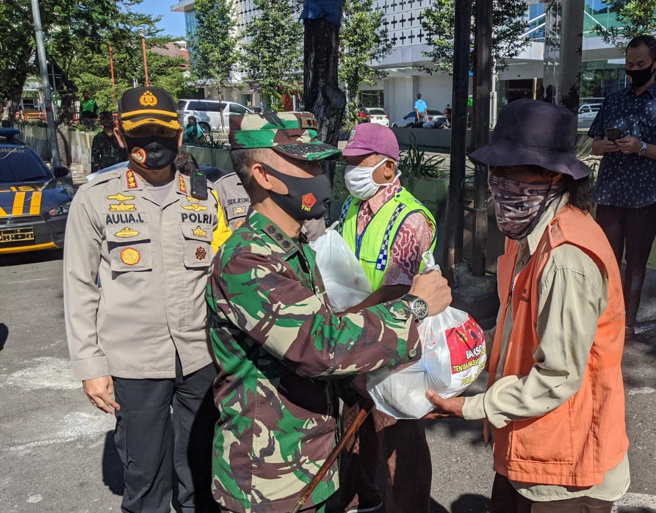 MASPOLIN || SEMARANG – Komandan Pangkalan TNI Angkatan Laut (Danlanal) Semarang Kolonel Laut (P) Nazarudin, CHRMP., mendampingi Kepala Polisi Resort Kota Besar (KAPOLRESTABES) Semarang Kombes Pol Auliansyah Lubis, S.I.K., M.K. membagikan sembako kepada warga yang terdampak Covid -19 yang berlokasi di depan halaman Rumah Sakit Telogorejo Jl KH.Ahmad Dahlan Semarang . Jumat (17/07).