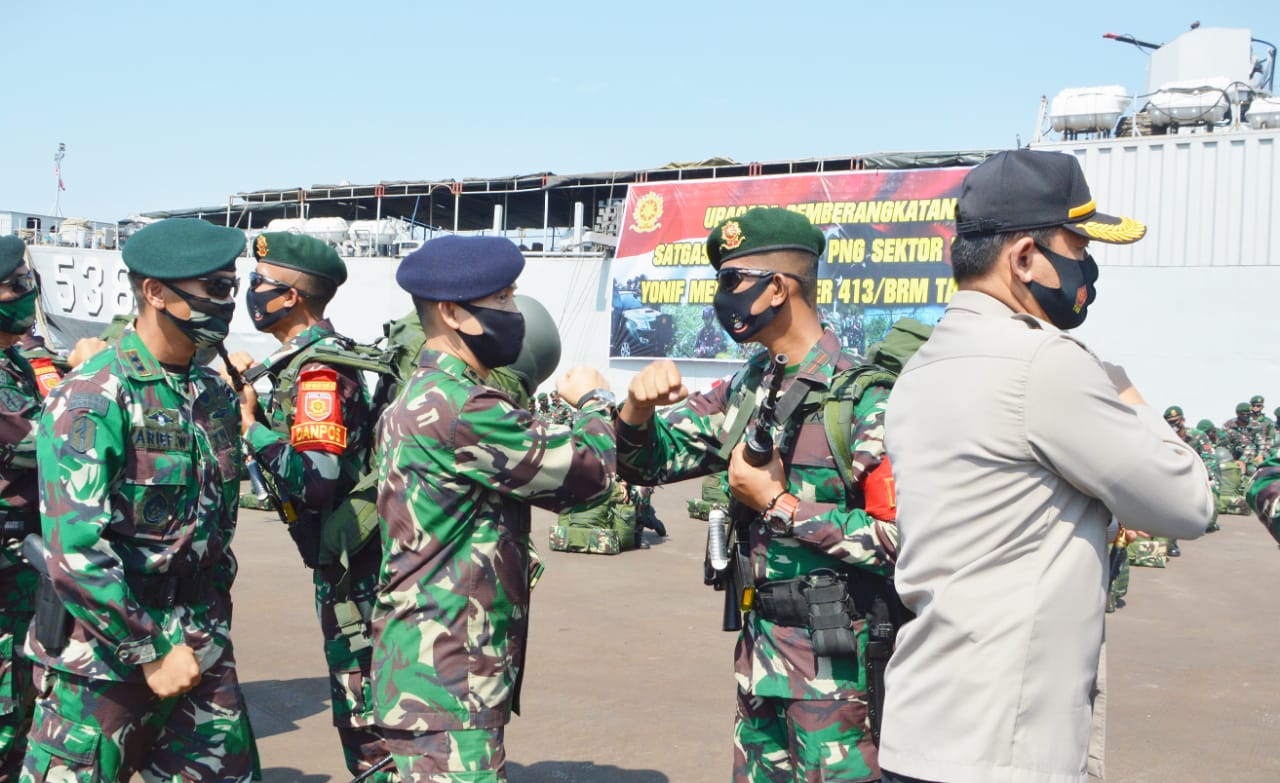 Pemberangkatan Satgas Pamtas RI – PNG sektor utara yang berjumlah kurang lebih 450 orang akan menggunakan transportasi Kapal milik TNI Angkatan Laut yaitu KRI Teluk Hading – 538 dengan Komandan kapal Letkol Laut (P) Roni S.T., M.Tr.Hanla.