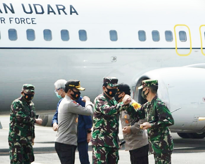 MASPOLIN || SEMARANG – Komandan Pangkalan TNI Angkatan Laut (Danlanal ) Semarang, Kolonel Laut (P) Nazarudin, CHRMP., turut menyambut kedatangan Panglima TNI Marsekal TNI Hadi Tjahjanto, S.I.P. dan ibu, Kapolri Jenderal Pol Drs. Idham Azis M. SI dan ibu beserta rombongan di Apron Alfa Pangkalan Udara Utama TNI AD Jendral Ahmad Yani Semarang dengan menggunakan Pesawat Boeing 737 A-7306 Milik TNI AU dengan Pilot Mayor Pnb Hakim dalam rangka melaksanakan kunjungan kerja monitoring Penanganan Covid-19 di wilayah Semarang. Sabtu 20/6/2020.