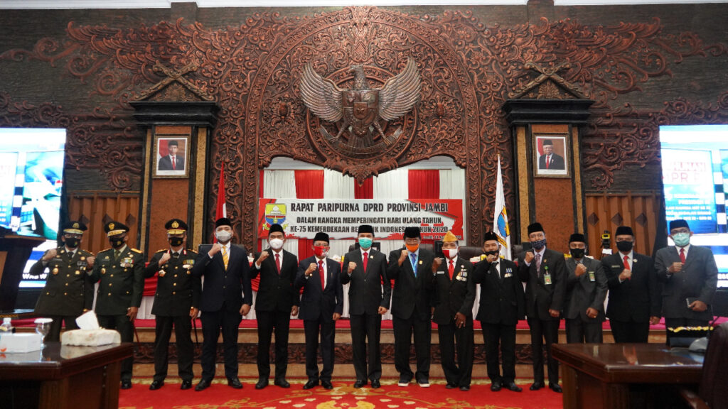 Jambi, Maspolin.id—Komandan Korem 042/Gapu, Brigjen TNI M. Zulkifli bersama Forum Koordinasi Pimpinan Daerah atau Forkopimda Provinsi Jambi menyaksikan pidato kenegaraan Presiden Joko Widodo melalui Vidcon dalam acara Sidang Tahunan MPR RI Tahun 2020 dan menjelang HUT ke-75 Kemerdekaan RI di ruang rapat Paripurna Gedung Dewan Perwakilan Rakyat Daerah (DPRD) Provinsi Jambi, Jum’at (14/8/2020).