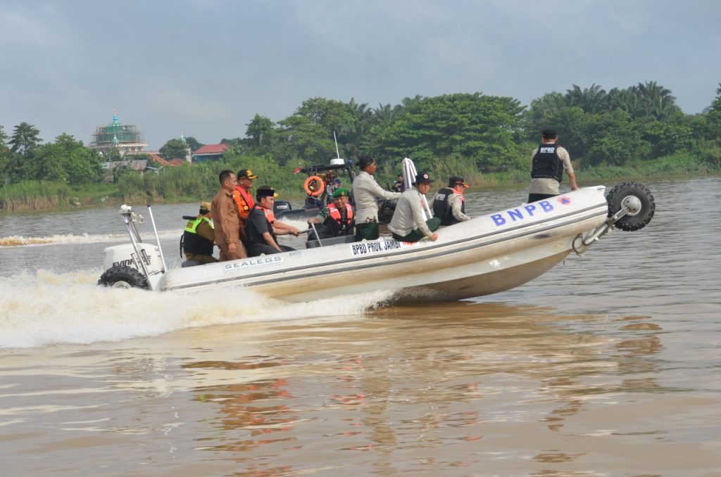 Usai melaksanakan Apel Siaga, para pejabat tersebut meninjau Dedit Air Sungai Batanghari dengan menggunakan Perahu Amphibi milik BPBD Prov Jambi.
