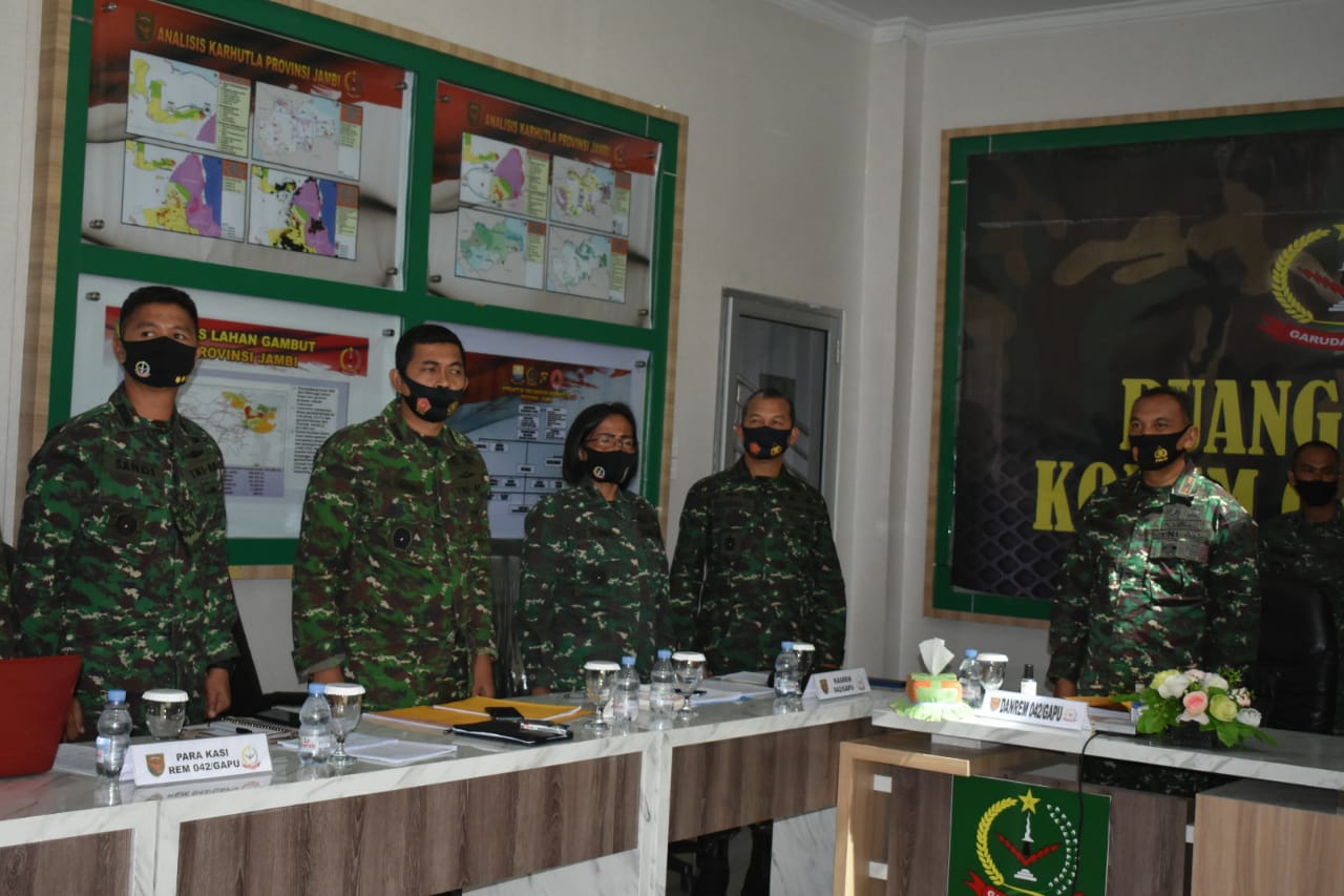 Jambi, Maspolin.id—Komandan Korem 042/Gapu Brigjen TNI M. Zulkifli, S.I.P, M.M bersama Kasrem, Para Kasi dan Komandan Satuan Jajaran Korem 042/Gapu mengikuti Vicon Rapat Evaluasi Pelaksanaan Program Kerja dan Anggaran Semester I Tahun 2020 Kodam II/Swj, bersama Pangdam II/Swj bertempat di Ruang C41SR (Poskodal) Korem 042/Gapu, jalan Jenderal Urip Sumoharjo Kota Jambi, Selasa (18/08/2020).
