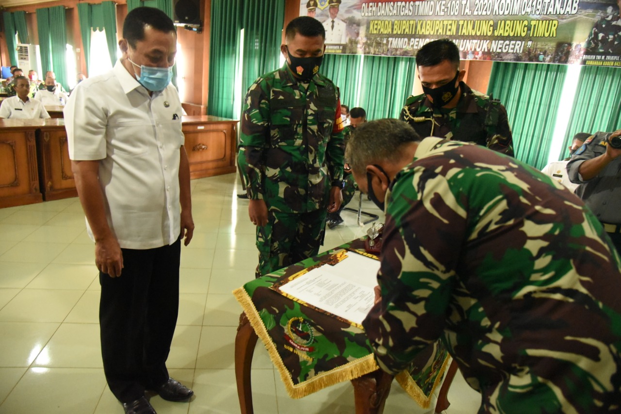 Jambi, Maspolin.id—Penutupan TNI Manunggal Membangun Desa (TMMD) ke-108 Tahun 2020 Kodim 0419/Tanjab di Kabupaten Tanjab Timur yang dilaksanakan di Ruang Pola Utama Kantor Bupati Tanjab Timur, dengan tema “TMMD Pengabdian untuk Negeri”. Dipimpin langsung oleh Danrem 042/Gapu, Brigjen TNI M. Zulkifli, S.I.P., M.M, Rabu (29/7/2020).