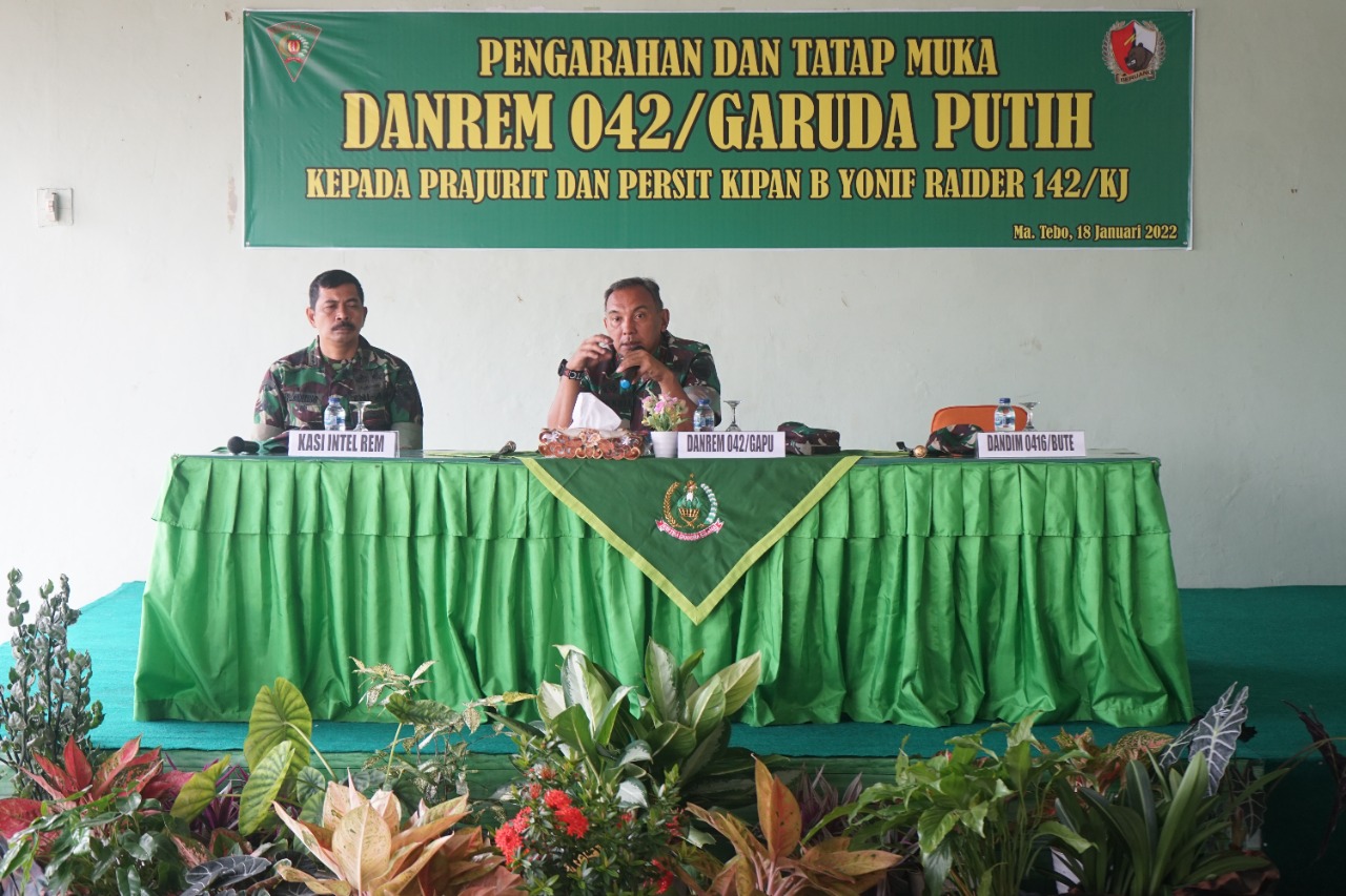 “Sebagai seorang prajurit, penugasan adalah suatu kehormatan dan kebanggaan yang diberikan oleh Negara, hal ini disampaikan Danrem 042/Gapu Brigjen TNI M. Zulkifli dalam arahannya kepada Prajurit dan Persit Kompi Senapan B Yonif R 142/KJ di Markas Kipan B Yonif R 142/KJ Kab. Tebo. Selasa (18/1/2022).